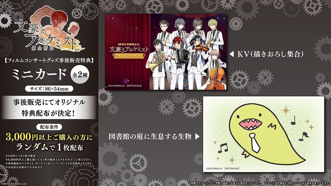 期間中、『10周年祭開幕記念「文豪とアルケミスト」フィルムコンサート(3月上旬以降お届け予定)』グッズを1注文につき税込3,000円以上ご購入で、【フィルムコンサートグッズ事後販売特典】ミニカード(全2種ランダム)を1枚プレゼント!