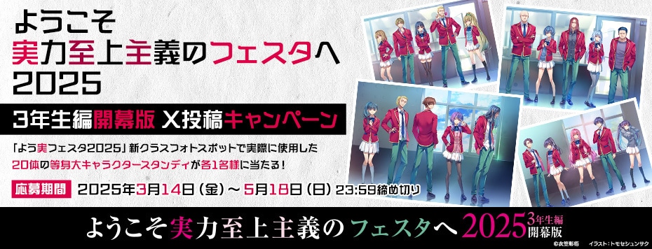「よう実フェスタ2025」会場に設置された新クラスフォトスポットの総勢20体の等身大キャラクタースタンディを抽選で各1名様にプレゼント!「カドスト」の公式Xアカウント(@kadokawastore)をフォローの上、「#よう実フェスタ2025」「#抽選に応募するキャラクター名」を付けてXで投稿していただいた人の中から、各キャラ抽選で1名様に実際に会場で展示されたスタンディをプレゼントします!