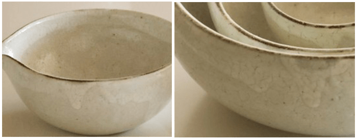 形はコロン、表面はツルンとした手触り。こっくりした表情は、粉引き(こひき)という技法を使っているからなのだそう。何よりご縁を感じたのが、罅(ひび)が入ったような模様です。だって『hibi hibiの台所』ですから。焼き上がった陶器を冷ます過程で、陶器本体と釉薬の収縮率の違いによって生まれる現象なのだとか。“貫入(かんにゅう)”というそうです。一つひとつ違う、自然が描くデザイン。もちろん汁が漏れることはありません。使いこむほどに味わいが増していくのが特徴だそうです。時間が経つほどに愛着が湧く片口の器、大切に育てていきたいです。