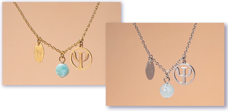 ネックレスにもブレスレットにもあしらったのは、ギリシャ文字の「Ψ(サイ)」。これは精神医学で、超能力を表す記号としても使われています。