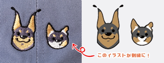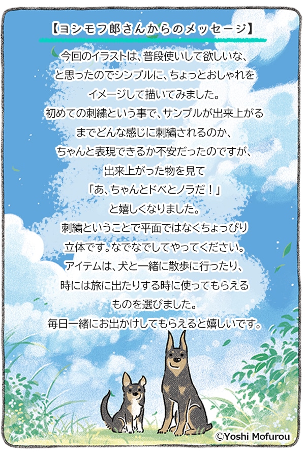 おさんぽしているドベとノラのイラストを描き下ろしていただき、刺繍で表現しました。サイドにジャックちゃんの可愛いタグ付き。