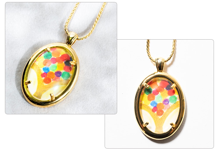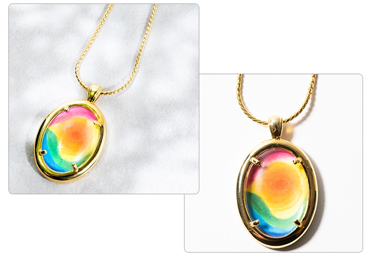 オーバル型のペンダントヘッドは、パワーアートの上に、ガラス製のドームのようなぷっくりと膨らんだモチーフが載せられています。