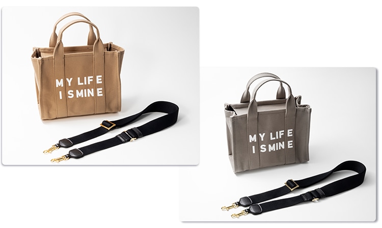 このトートバッグは、全面に大きく「MY LIFE IS MINE」というロゴをプリントしました。