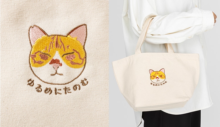 チャチャの愛らしい顔と「ゆるめにたのむ」の文字を刺繍で表現しています。