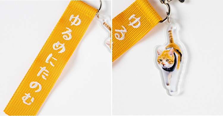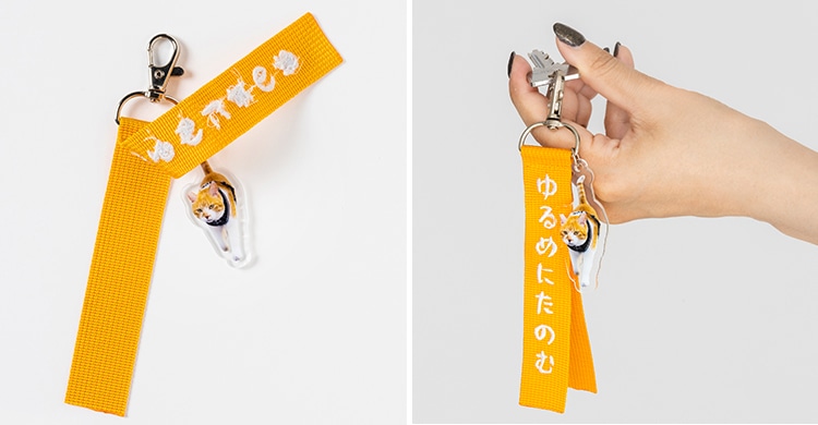 「ゆるめにたのむ」の文字を刺繍したストラップに、アクリルキーホルダーが付いています。