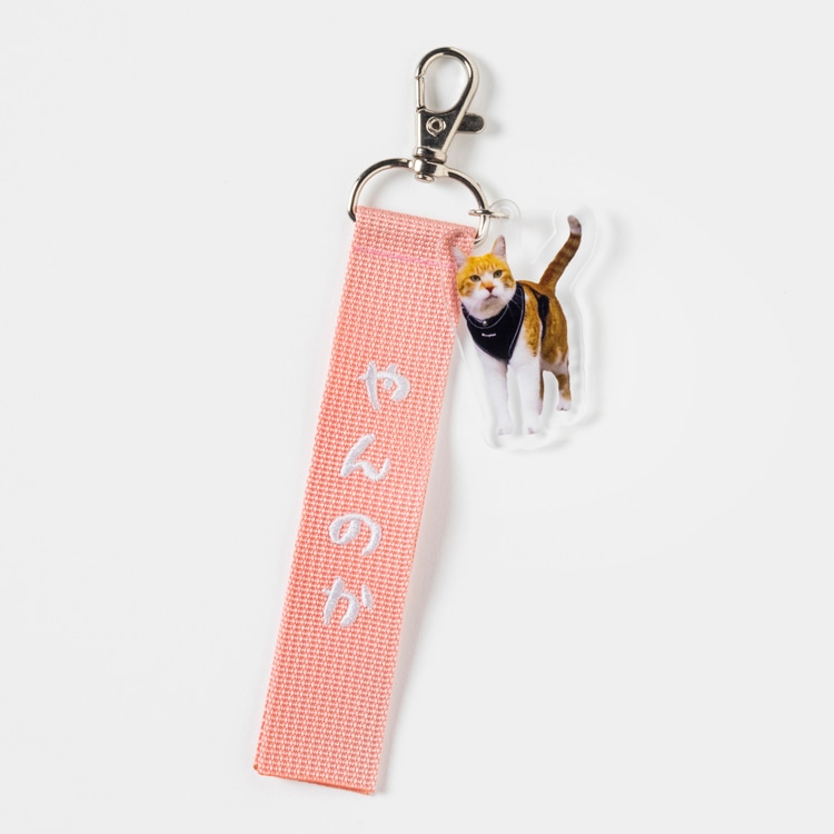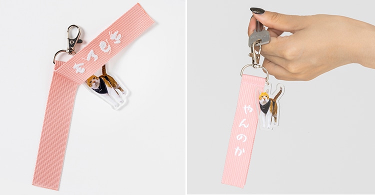 「やんのか」の文字を刺繍したストラップに、チャチャのアクリルキーホルダーが付いています。