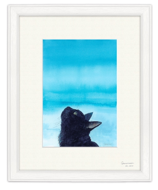 ある日、いつものように青い絵の具を塗っていたら、ふと、猫の綺麗な瞳を描きたいと思いました。スッと頭の中に、見上げる黒猫のイメージが浮かんできたんです。