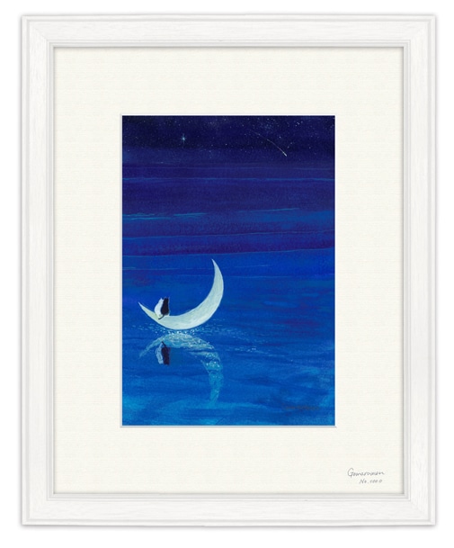 このようにしてできあがった絵は、不思議とファンタジーぽさがあり、ときに哀愁や郷愁がただよいます。満天の星空の下、風が吹き渡る草原、波のきらめく海岸、黒猫はいろいろなところを旅します。黒猫の旅に目的地はないのです。 自由に、楽しく、気ままに、そしてときに孤独に・・・。