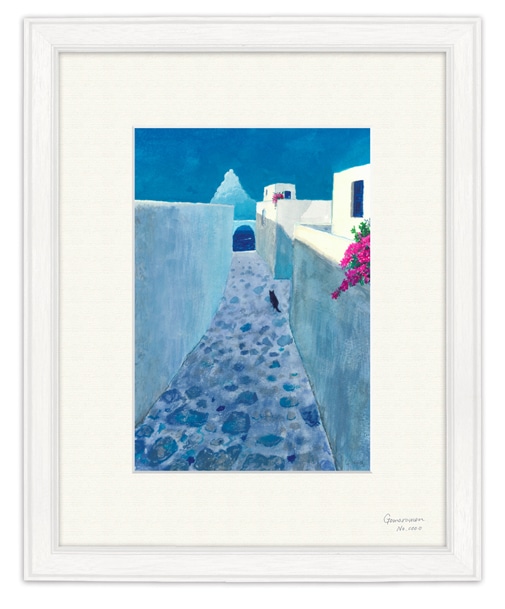 人影のない白い路地、かすかに聞こえる波の音、そして花の香り。午後の陽が白い壁を優しく照らす。