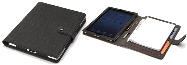 A5サイズノートとiPadが同時に使えるカバーパッド。ペンホルダーや名刺、カードを収納可能なポケットも装備。