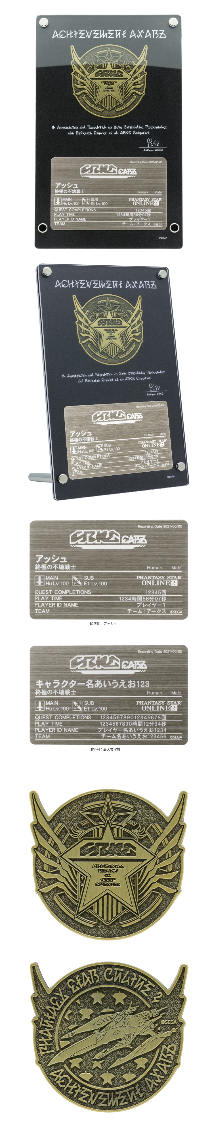 これを記念して、あなたがキャラクターと共に歩んできた歴史を金属製のカードにレーザーで刻印した、あなただけの「アークスカード」を作成いたします。このカードは、あなたのオラクル船団での功績を称える「アークス勲章」として、ウルク総司令より贈呈された記念メダルつきの盾に入れて飾ることができます。