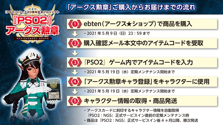・「アークス勲章キャラ登録」をアイテム使用期限(2021年5月19日定期メンテナンス開始)までに使用しなかった場合。