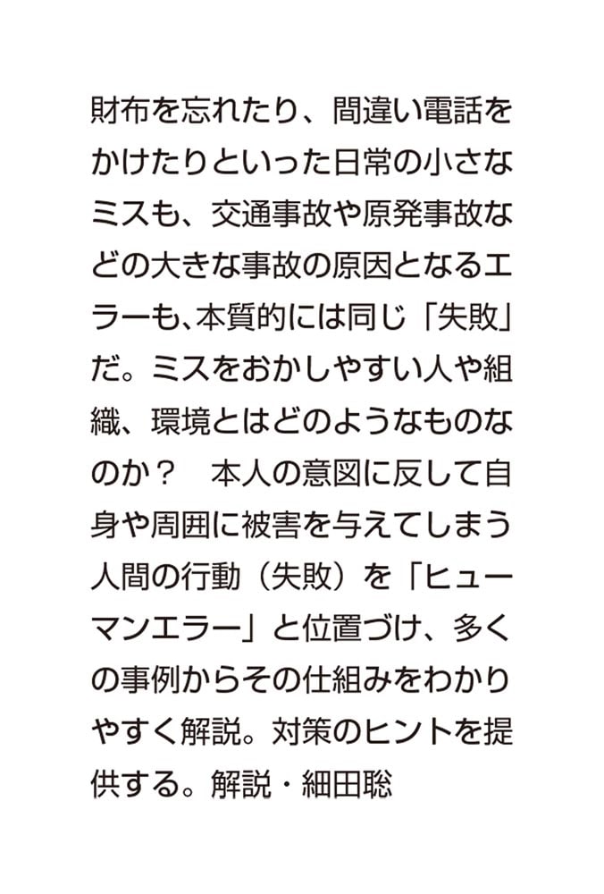 物忘れ、間違い電話、交通事故、原発事故。当人の能力や意図にかかわらず引き起こされてしまう失敗を「ヒューマンエラー」と位置付け、ミスをおかしやすい人や組織、環境、その仕組みと対策を解き明かす!