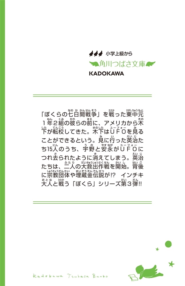 「ぼくらの七日間戦争」を戦った東中元1年2組の彼らの前に、アメリカから木下が転校してきた。木下はUFOを見ることができるという。見に行った英治たち15人のうち、宇野と安永がUFOにつれ去られたように消えてしまう。英治たちは、二人の大救出作戦を開始。背後に宗教団体や埋蔵金伝説が!? インチキ大人と戦う、ぼくらシリーズ第3弾!!