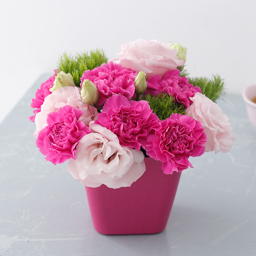 カーネーションには「母の愛情」という花言葉があります。ふだんはなかなか言えない感謝の意を、この花に託してみませんか。『花時間マルシェ』では、カーネーションに旬の花を合わせた市場直送のアレンジをお届け。お得感たっぷりのボリュームが自慢です。箱を開けた瞬間、お母さんが笑顔になること請け合い!