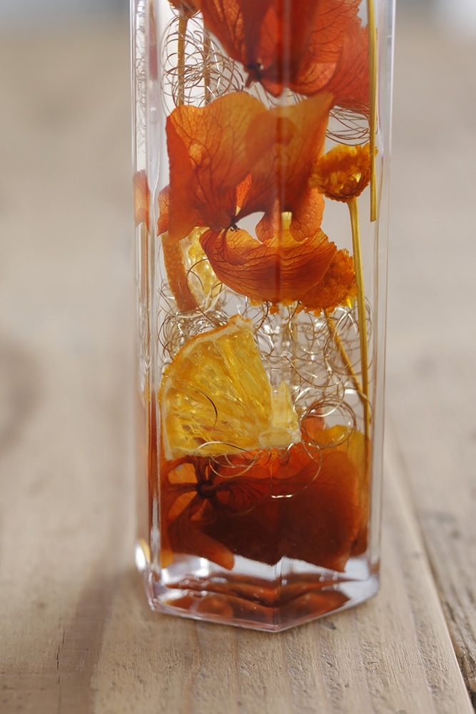深みのあるオレンジ色の花を、光の屈折が美しい六角形のボトルに、空間を生かしながらふんわりと詰めました。間にはスライスオレンジを忍ばせ、くるくると丸めたゴールドのワイヤーを大人っぽいアクセントにして。口元には高級感のあるラインストーンのリボンを巻き、ポイントとして「For You」タグと、封シールもプラスしました。上質なシリコンオイルを使用しているので、寒い地域でもボトルのなかが濁りません。
