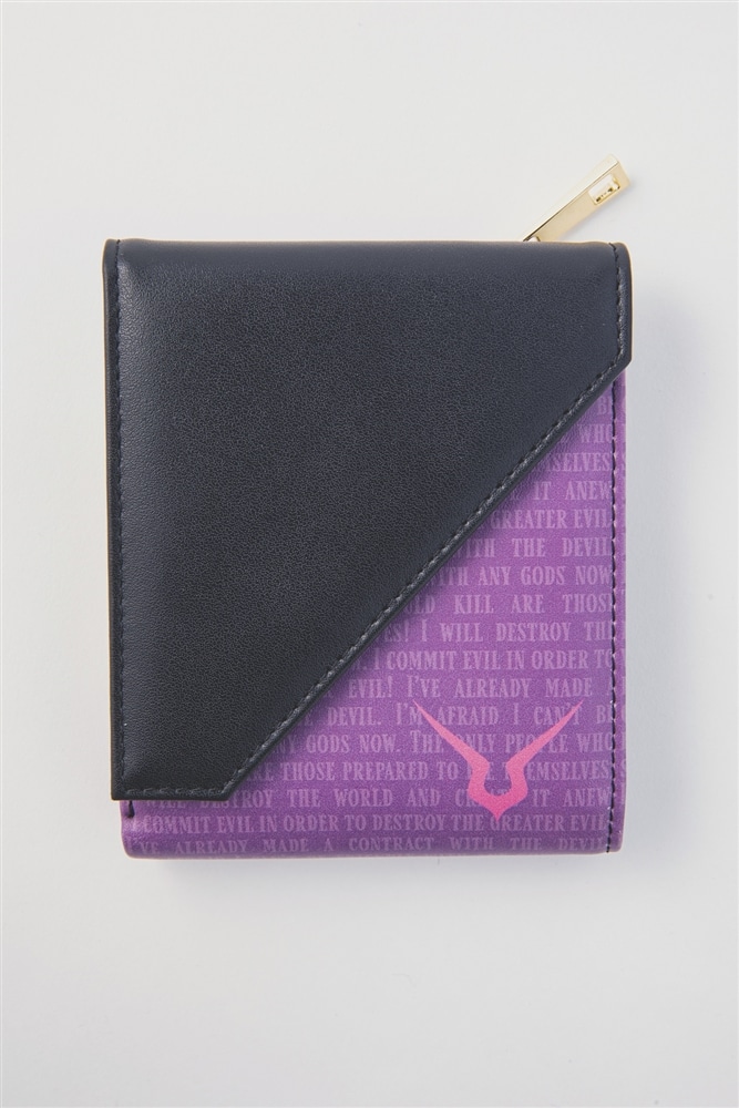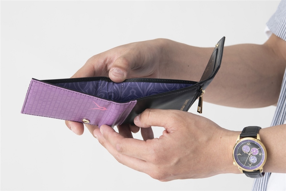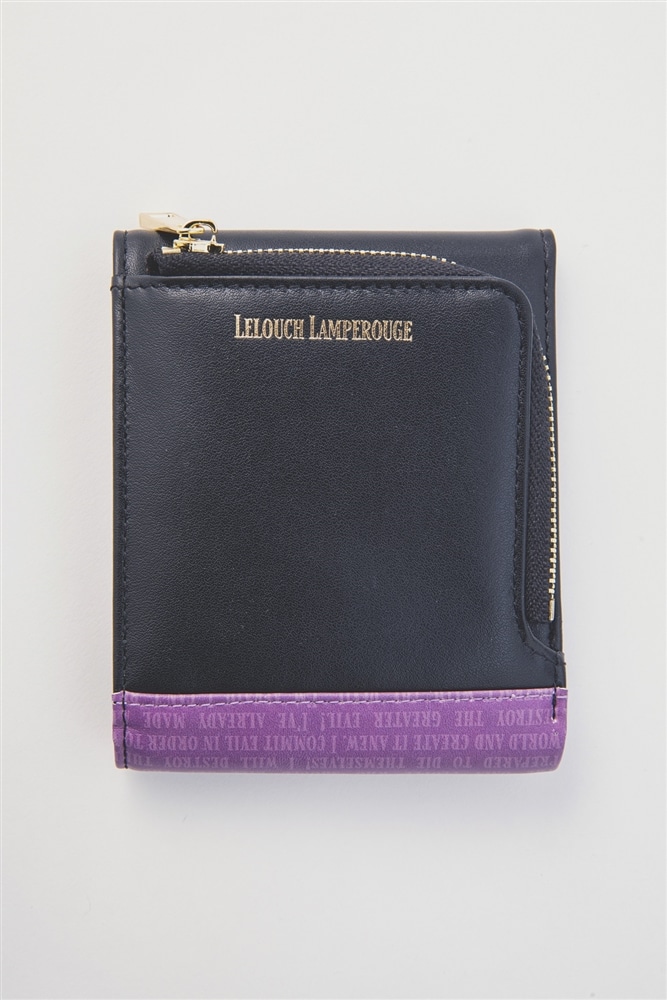 表面片方は、アッシュフォード学園制服をイメージした黒に、金色で「Lelouch Lamperouge」の名前を綴る。ファスナー付きコイン入り部分を開くと、アッシュフォード学園の校章が現れる。