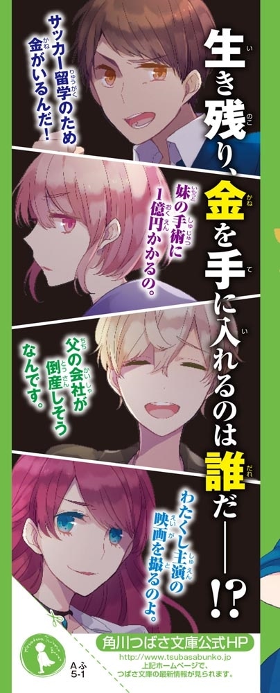 春馬のもとに謎めいたゲームへの招待状が届いた。優勝賞金は1億円。参加条件には、1)金がほしくてたまらないこと 2)親に秘密で外泊できること 3)だれにも言わないこと 4)敗者には命の保証がなくてもかまわないこと…とあった。会場にむかった春馬は、他の参加者とともに閉じこめられる。「あたしは負けないわ」「絶対に勝つ!」目をぎらつかせる少年少女。勝者はただ1人。春馬はこのサバイバルを生き残れるのか!?