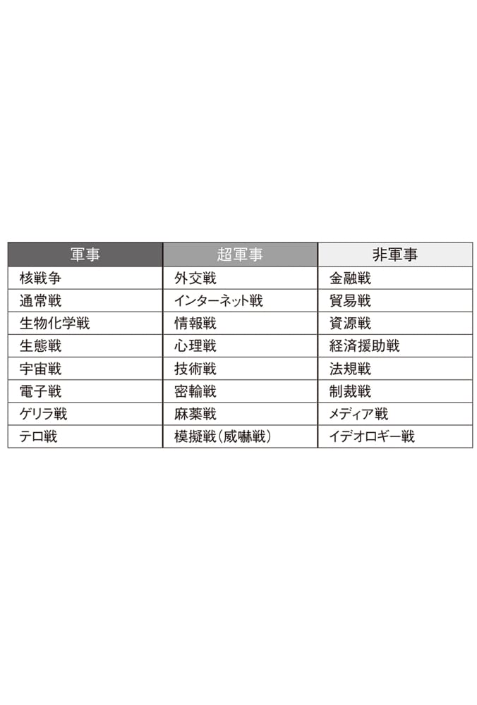 ほかにも密輸戦(経済秩序に打撃)、メディア戦(他国の世論を誘導)、麻薬戦、ハッカー戦、技術戦(標準を作って特許を独占)、資源戦、経済援助戦(恩恵を施してコントロール下に置く)、文化戦(異分子を同化させる)……。戦争の姿はかつてとは大きく変わったのです。