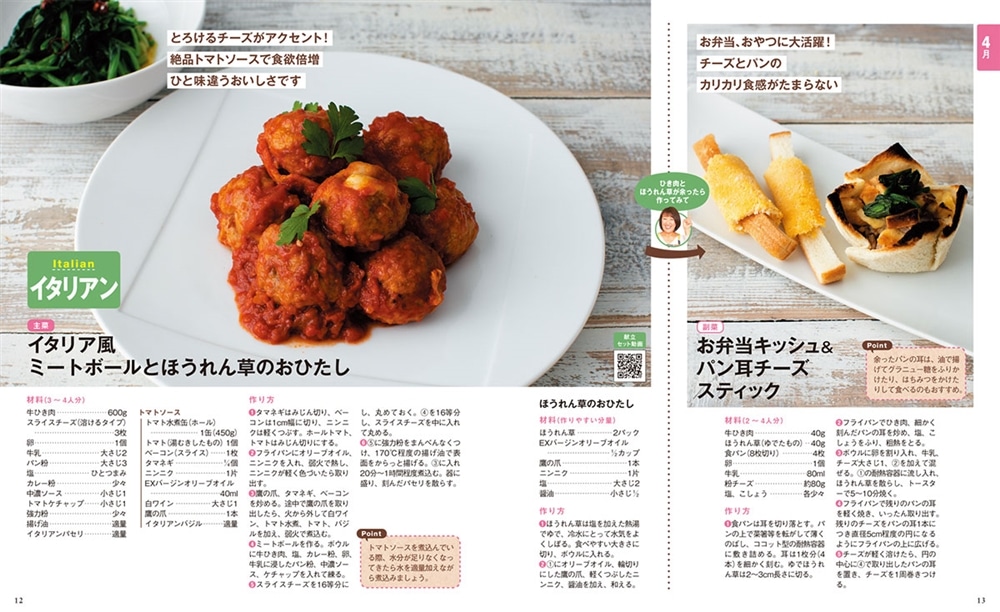 ・4月/イタリア風ミートボール&ほうれん草のおひたし(主菜)&お弁当キッシュ&パン耳チーズスティック(副菜)・・・5セット紹介