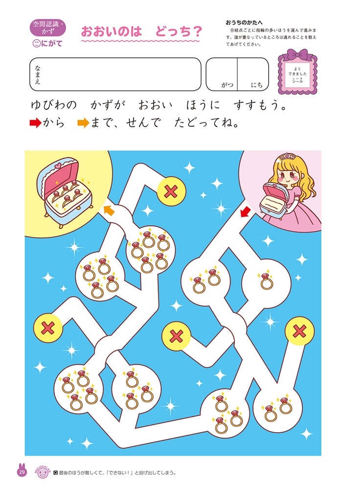 (5) ことばや数に関する迷路も取り上げて、ひらがなや数字に親しめるページにも取り組めます。