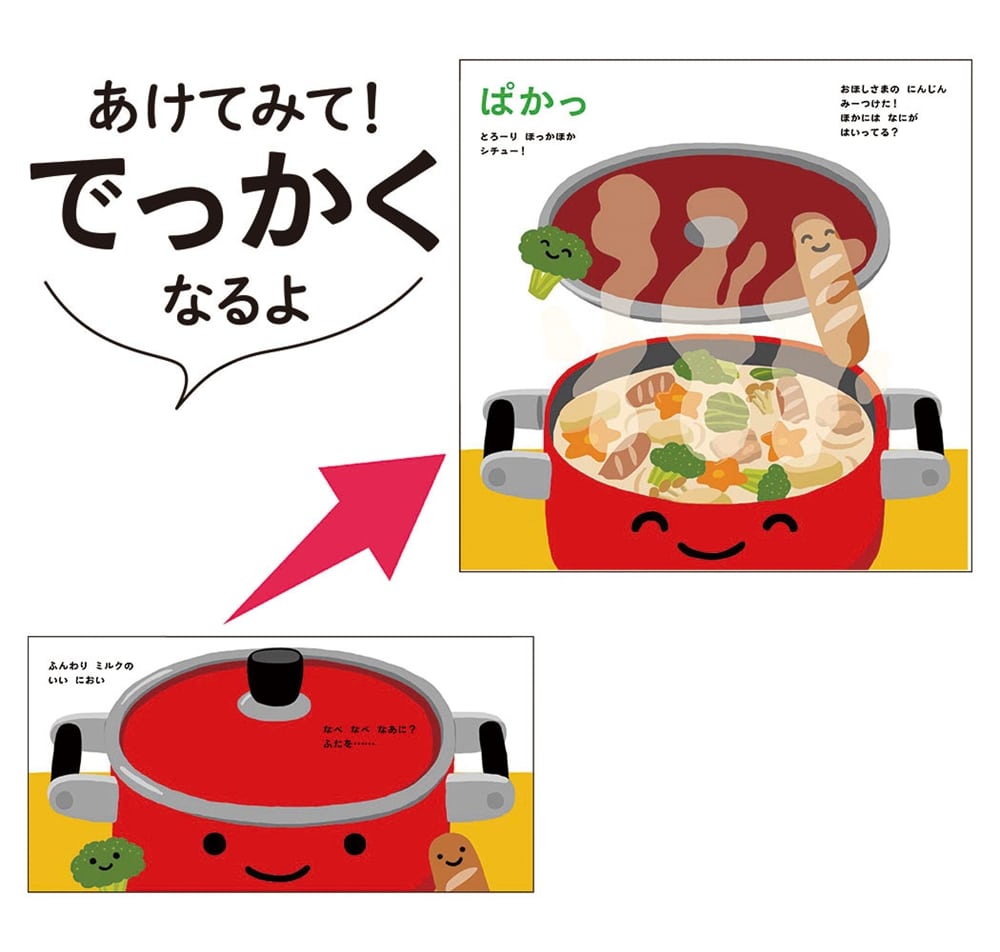 おなべから いいにおいが するよ。なべなべ なあに? ふたを「ぱかっ」っと大きく上に開くと子どもたちの大好きな料理が大画面! 親子でびっくり&にっこり。いないいないばあ絵本の新定番で贈り物にも最適!