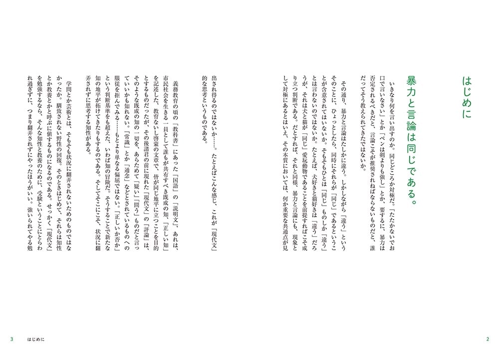 義務教育の頃の「教科書」にあった「国語」の「説明文」、あれは、市民社会を生きる一員として誰もが共有すべき既成の知、「正しい知」を記述した、教育ないし啓蒙の文章で、皆が同じ地平に立つことを目的とするものだったが、その後に現れた「現代文」の「評論」は、そのような既成の知の一切を、あらためて「疑い」「問う」ものだと言っていいかも知れない。「常識」とか「通念」などとされているものへの服従を拒んでみる……もとより単なる偏屈ではない。「正しいか否か」という判断基準をも超えた、いわば知の冒険だ。そうすることで新たな知の地平が拓けてきたりもするのである。そしてそこにこそ、状況に翻弄されずに思考する知性がある。