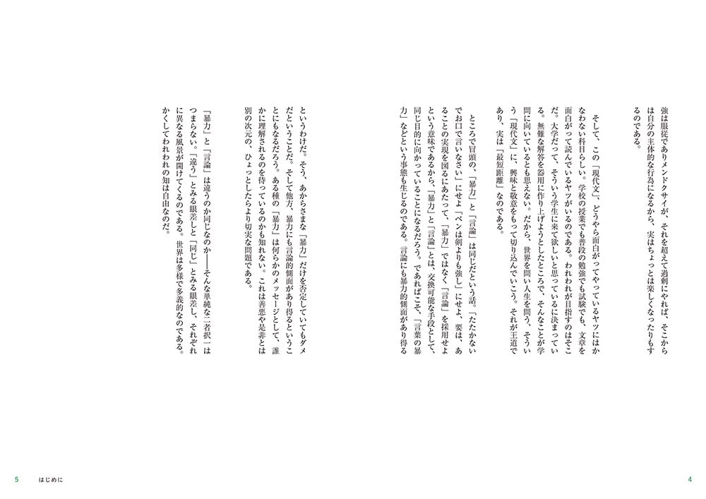 そして、この「現代文」、どうやら面白がってやっているヤツにはかなわない科目らしい。学校の授業でも普段の勉強でも試験でも、文章を面白がって読んでいるヤツがいるのである。われわれが目指すのはそこだ。大学だって、そういう学生に来て欲しいと思っているに決まっている。無難な解答を器用に作り上げようとしたところで、そんなことが学問に向いているとも思えない。だから、世界を問い人生を問う、そういう「現代文」に、興味と敬意をもって切り込んでいこう。それが王道であり、実は「最短距離」なのである。