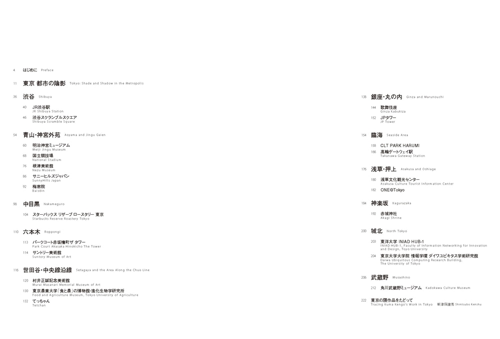 「撮影に取り組むにあたり、まず行なったのは、建築家・隈研吾にとっての東京の原風景をたずね、私自身の足で歩き経験してみることだった。(…)全体の撮影において留意したのは、この原風景を訪れたときの、過去と現在の往還の過程で心の中に生起した微かな感覚のフォルムを保持することだった。そして、それを育てていくような意識でそれぞれの建築に向き合うことである。」 (新津保建秀)