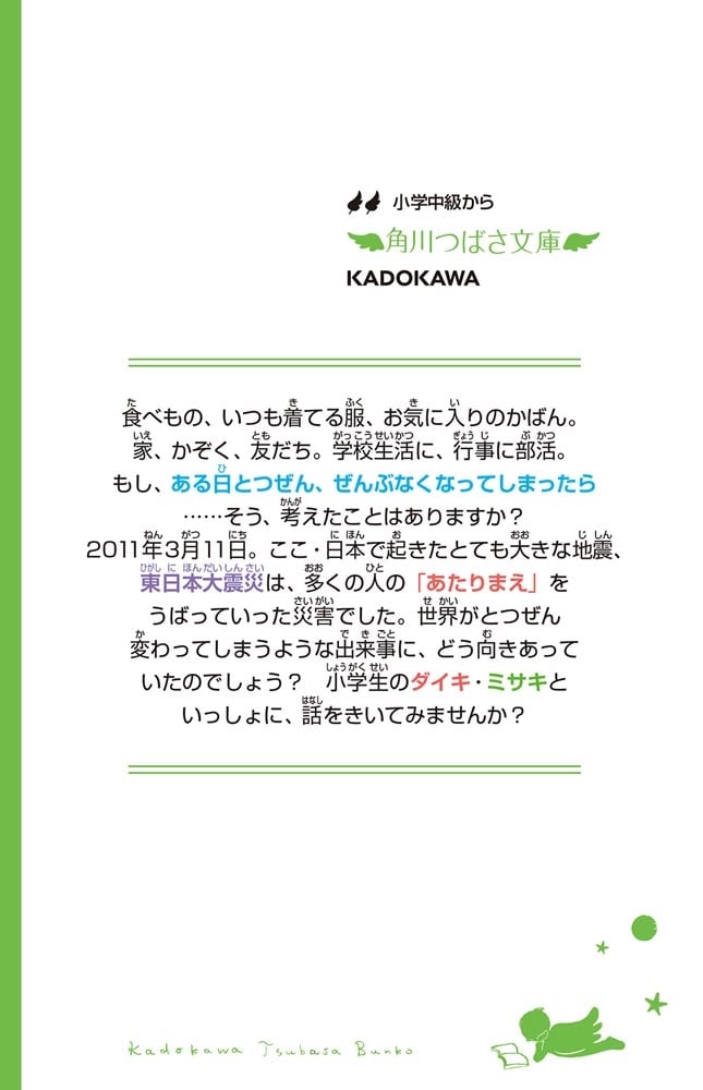 2011年3月11日。ここ・日本で起きたとても大きな地震、東日本大震災は、多くの人の「あたりまえ」をうばっていった災害でした。