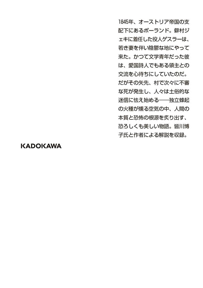 1845年、オーストリア帝国の支配下にあるポーランド。寒村ジェキに赴任した役人ゲスラーは、若き妻を伴い陰鬱な地にやってきた。かつて文学青年だった彼は、愛国詩人でもある領主との交流を心待ちにしていたのだ。だがその矢先、村で次々に不審な死が発生し、人々は土俗的な迷信に怯え始める――独立蜂起の火種が燻る空気の中、人間の本質と恐怖の根源を炙り出す、恐ろしくも美しい物語。皆川博子氏と作者による解説を収録。