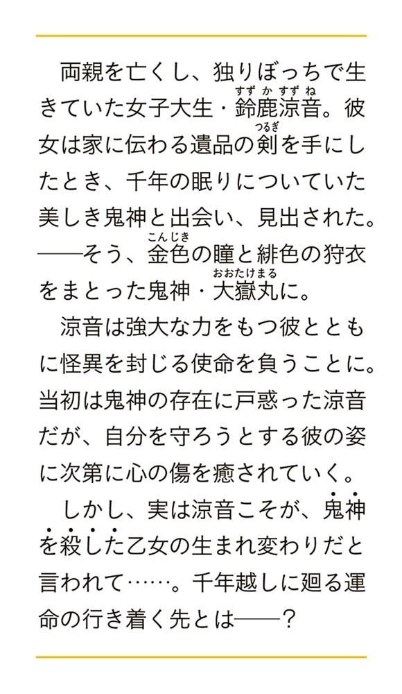しかし、実は涼音こそが、鬼神を殺した乙女の生まれ変わりだと言われて……。千年越しに廻る運命の行き着く先とは――?
