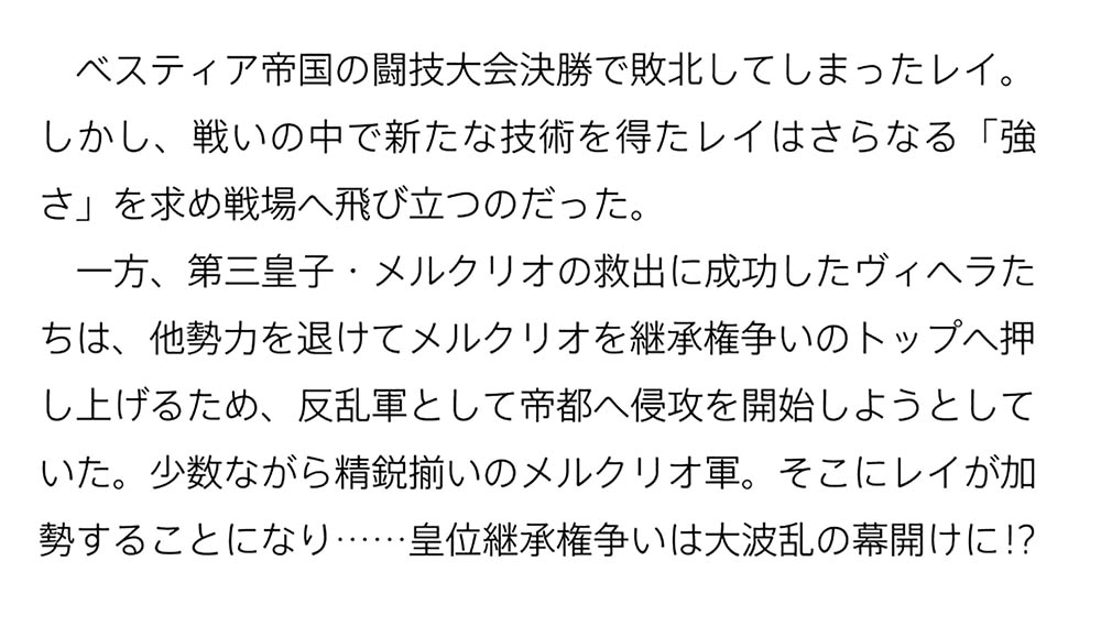 一方、第三皇子・メルクリオの救出に成功したヴィヘラたちは、他勢力を退けてメルクリオを継承権争いのトップへ押し上げるため、反乱軍として帝都へ侵攻を開始しようとしていた。少数ながら精鋭揃いのメルクリオ軍。そこにレイが加勢することになり……皇位継承権争いは大波乱の幕開けに!?