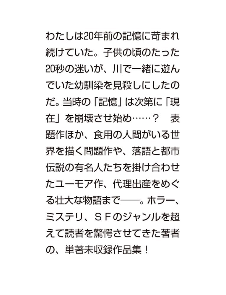 表題作ほか、食用の人間がいる世界を描く問題作や、落語と都市伝説の有名人たちを掛け合わせたユーモア作、代理出産をめぐる壮大な物語まで――。