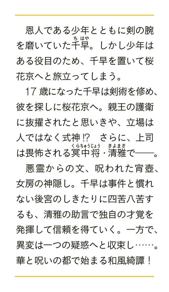 17歳になった千早は剣術を修め、彼を探しに桜花京へ。親王の護衛に抜擢されたと思いきや、立場は人ではなく式神!? さらに、上司は畏怖される冥の中将・清雅(きよまさ)でーー。