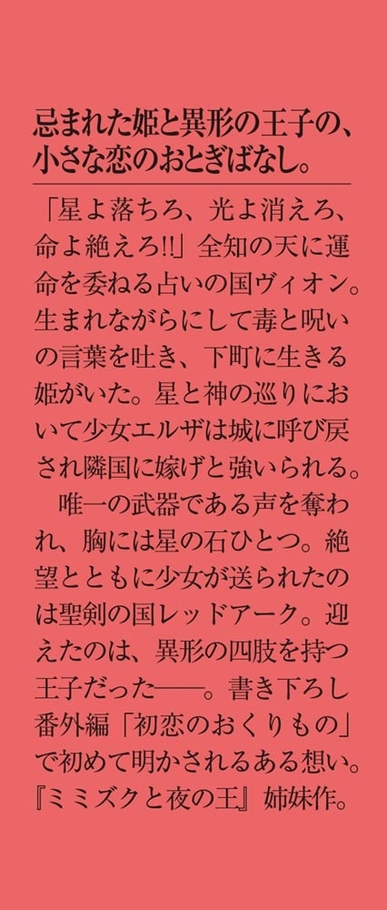 唯一の武器である声を奪われ、胸には星の石ひとつ。絶望とともに少女が送られたのは聖剣の国レッドアーク。迎えたのは、異形の四肢を持つ王子だった――。
