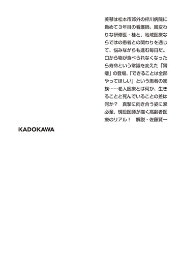 美琴は松本市郊外の梓川病院に勤めて3年目の看護師。風変わりな研修医・桂と、地域医療ならではの患者との関わりを通じて、悩みながらも進む毎日だ。口から物が食べられなくなったら寿命という常識を変えた「胃瘻」の登場、「できることは全部やってほしい」という患者の家族……老人医療とは何か、生きることと死んでいることの差は何か? 真摯に向き合う姿に涙必至、現役医師が描く高齢者医療のリアル! 解説・佐藤賢一