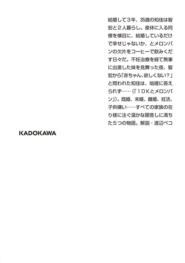 結婚して3年、35歳の知佳は智宏と2人暮らし。産休に入る同僚を横目に、結婚しているだけで幸せじゃないか、とメロンパンの欠片をコーヒーで飲みくだす日々だ。不妊治療を経て無事に出産した妹を見舞った夜、智宏から「赤ちゃん、欲しくない?」と問われた知佳は、咄嗟に答えられず……(「1DKとメロンパン」)。既婚、未婚、離婚、妊活、子供嫌い……すべての家族の在り様に注ぐ温かな眼差しに満ちた5つの物語。解説・渡辺ペコ