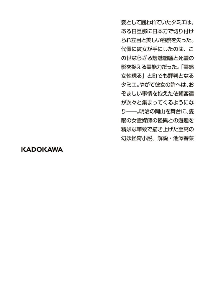 明治の岡山を舞台に、隻眼の女霊媒師の怪異との邂逅を精妙な筆致で描き上げた至高の幻妖怪奇小説。