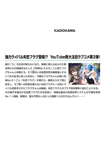 謎の「×」の正体が明らかになり、無事に閉じ込められた異世界からの帰還をはたした「死神No.269」こと死亡フラグちゃんと仲間たち。モブ男のいる仮想世界を練習場とするいつもの生活に戻った矢先に、今度はフラグちゃんの前に死神No.51こと「失恋フラグ」が現れた。偶然からモブ男に恋をし、モブ男への好意を隠さない失恋フラグに一方的にライバル宣言をされたフラグちゃんは動揺。失恋フラグとのフラグ回収競争に挑むことになる。その様子を面白がる恋愛フラグたちを尻目に、神様は最近の仮想世界システムの不調を死神No.1へ相談。事態は、誰も予想もしなかった展開へとなだれ込んでいく――!