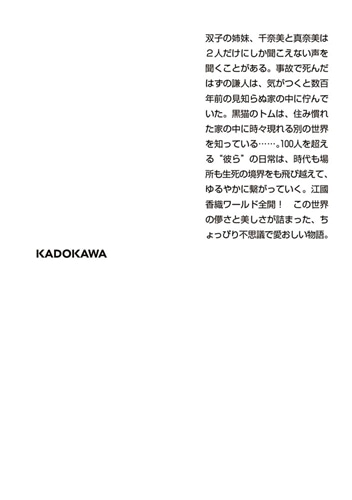 双子の姉妹、千奈美と真奈美は2人だけにしか聞こえない声を聞くことがある。事故で死んだはずの謙人は、気がつくと数百年前の見知らぬ家の中に佇んでいた。黒猫のトムは、住み慣れた家の中に時々現れる別の世界を知っている……。100人を超える”彼ら”の日常は、時代も場所も生死の境界をも飛び越えて、ゆるやかに繋がっていく。