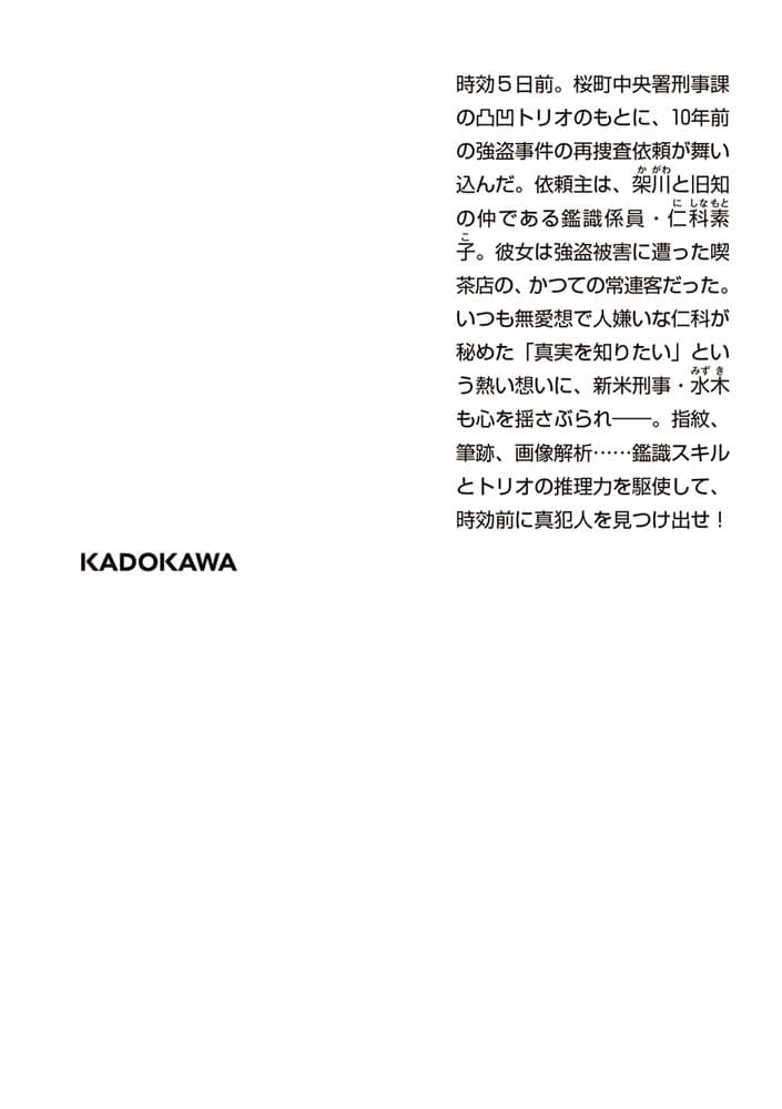 時効5日前。桜町中央署刑事課の凸凹トリオのもとに、10年前の強盗事件の再捜査依頼が舞い込んだ。依頼主は、架川と旧知の仲である鑑識係員・仁科素子。彼女は強盗被害に遭った喫茶店の、かつての常連客だった。いつも無愛想で人嫌いな仁科が秘めた「真実を知りたい」という熱い想いに、新米刑事・水木も心を揺さぶられ――。指紋、筆跡、画像解析……あらゆる鑑識スキルとトリオの推理力を駆使して、時効前に真犯人を見つけ出せ!
