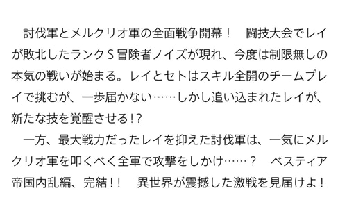 闘技大会でレイが敗北したランクS冒険者ノイズが現れ、今度は制限無しの本気の戦いが始まる。レイとセトはスキル全開のチームプレイで挑むが、一歩届かない……しかし追い込まれたレイが、新たな技を覚醒させる!?