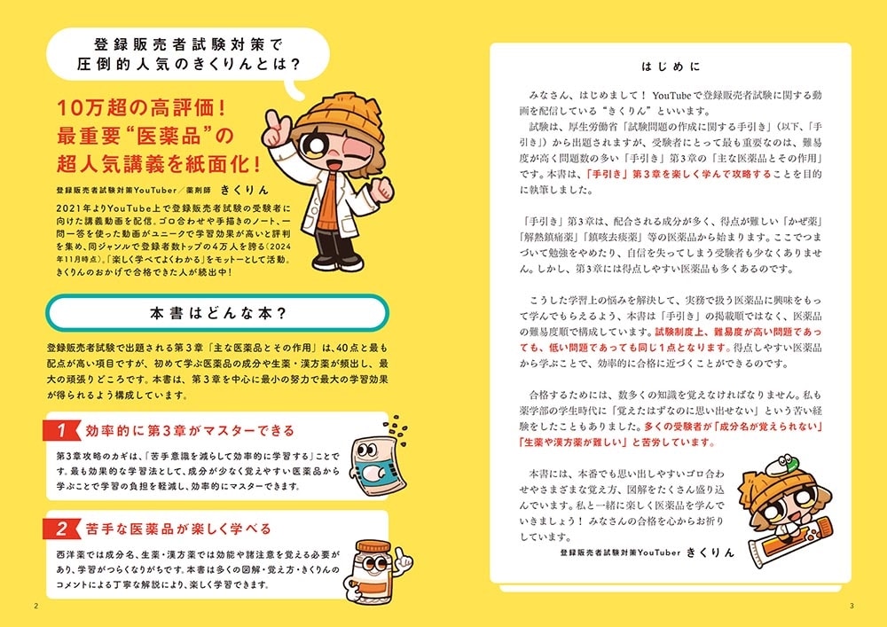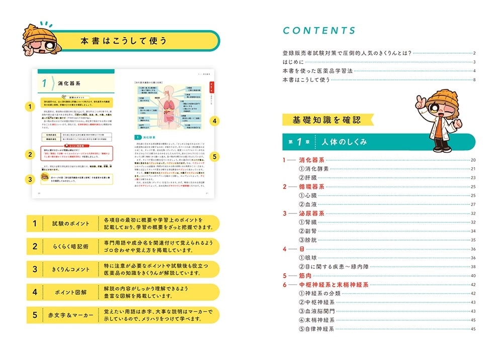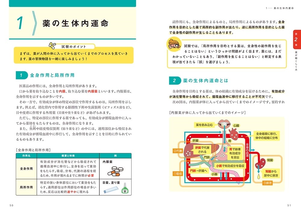 試験は、厚生労働省「試験問題の作成に関する手引き」(以下、「手引き」)から出題されますが、受験者にとって最も重要なのは、難易度が高く問題数の多い「手引き」第3章「主な医薬品とその作用」です。本書は、「手引き」第3章を楽しく学んで攻略することを目的に執筆しました。