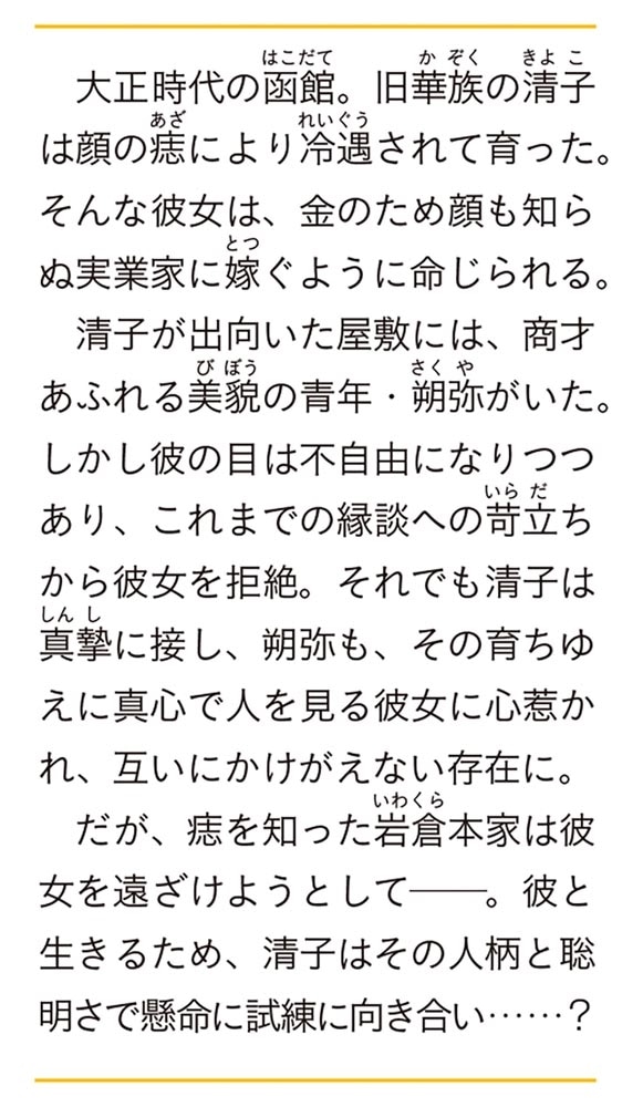 大正時代の函館。旧華族の清子は顔の痣により冷遇されて育った。そんな彼女は、金のため顔も知らぬ実業家に嫁ぐように命じられる。