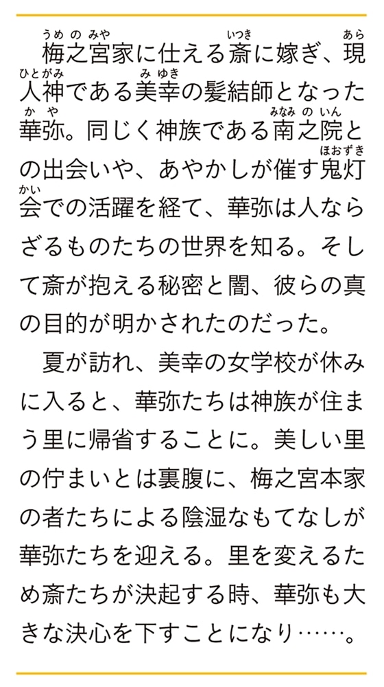 夏が訪れ、美幸の女学校が休みに入ると、華弥たちは神族が住まう里に帰省することに。美しい里の佇まいとは裏腹に、梅之宮本家の者たちによる陰湿なもてなしが華弥たちを迎える。里を変えるため斎たちが決起する時、華弥も大きな決心を下すことになり……。