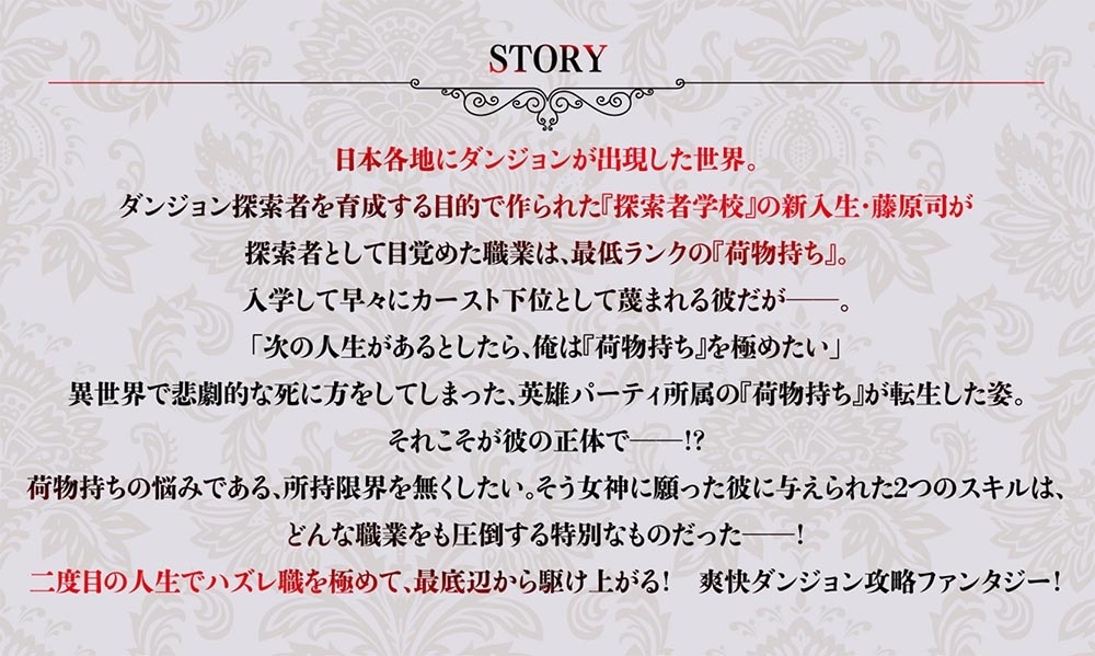 ダンジョン探索者を育成する目的で作られた『探索者学校』の新入生・藤原司が探索者として目覚めた職業は、最低ランクの『荷物持ち』。