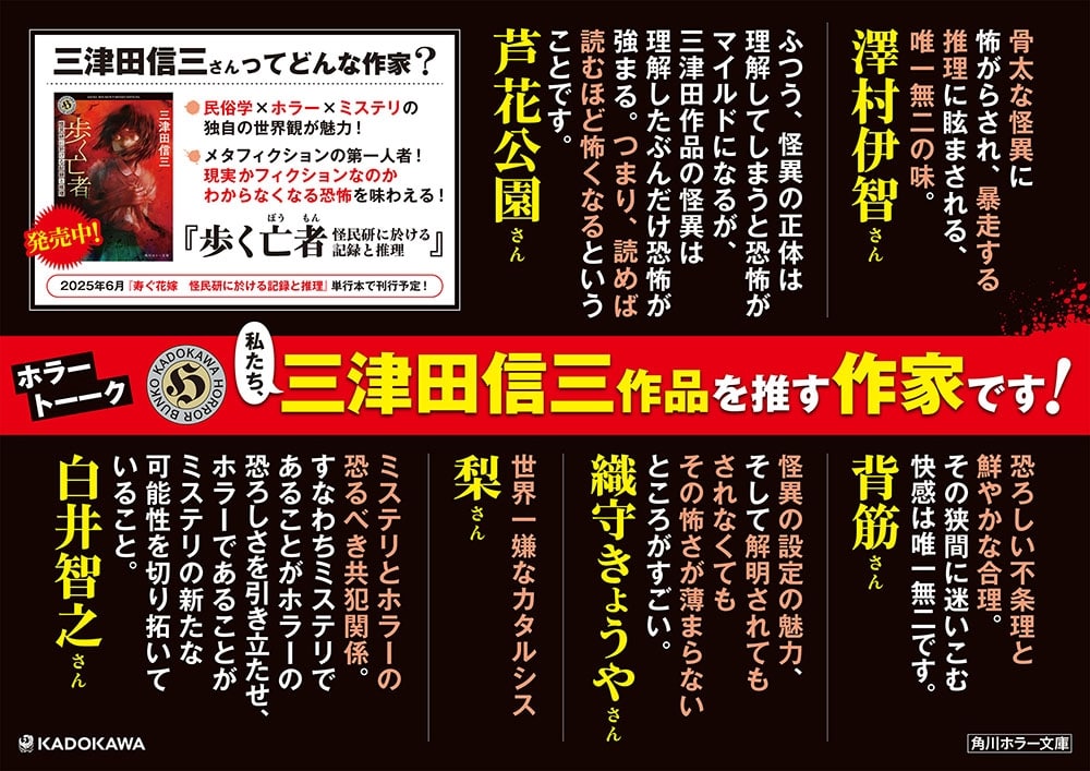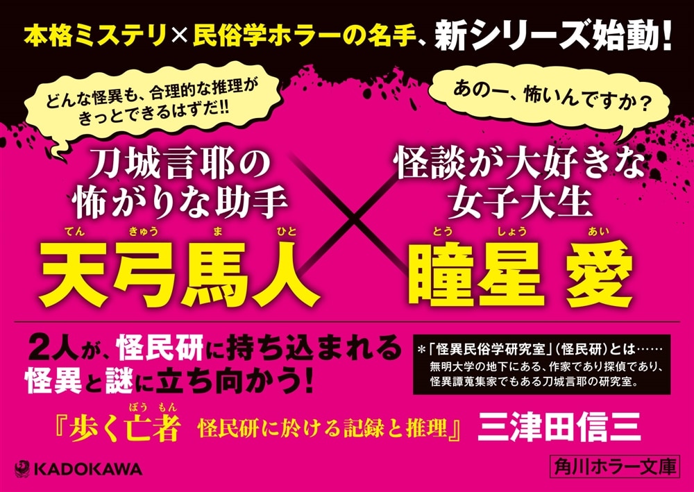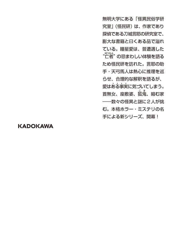 無明大学にある「怪異民俗学研究室」(怪民研)は、作家であり探偵である刀城言耶の研究室で、膨大な書籍と曰くある品で溢れている。瞳星愛は、昔遭遇した“亡者”の忌まわしい体験を語るため怪民研を訪れた。言耶の助手・天弓馬人は熱心に推理を巡らせ、合理的な解釈を語るが、愛は“ある事実”に気づいてしまう。首無女、座敷婆、狐鬼、縮む家――数々の怪異と謎に2人が挑む。本格ホラー・ミステリの名手による新シリーズ、開幕! 三津田信三ワールドの魅力が凝縮された連作短編集。