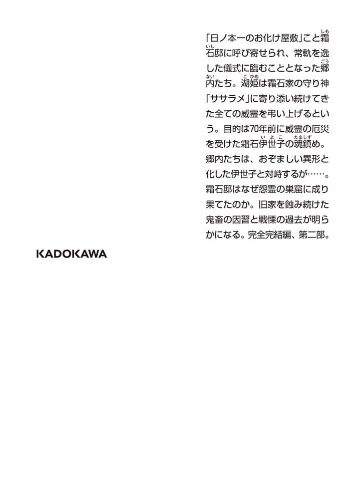 郷内たちは、七十年前に威霊の厄災を受け霜石家を徘徊し続ける怨霊となった異形、霜石伊世子と対峙するが……。