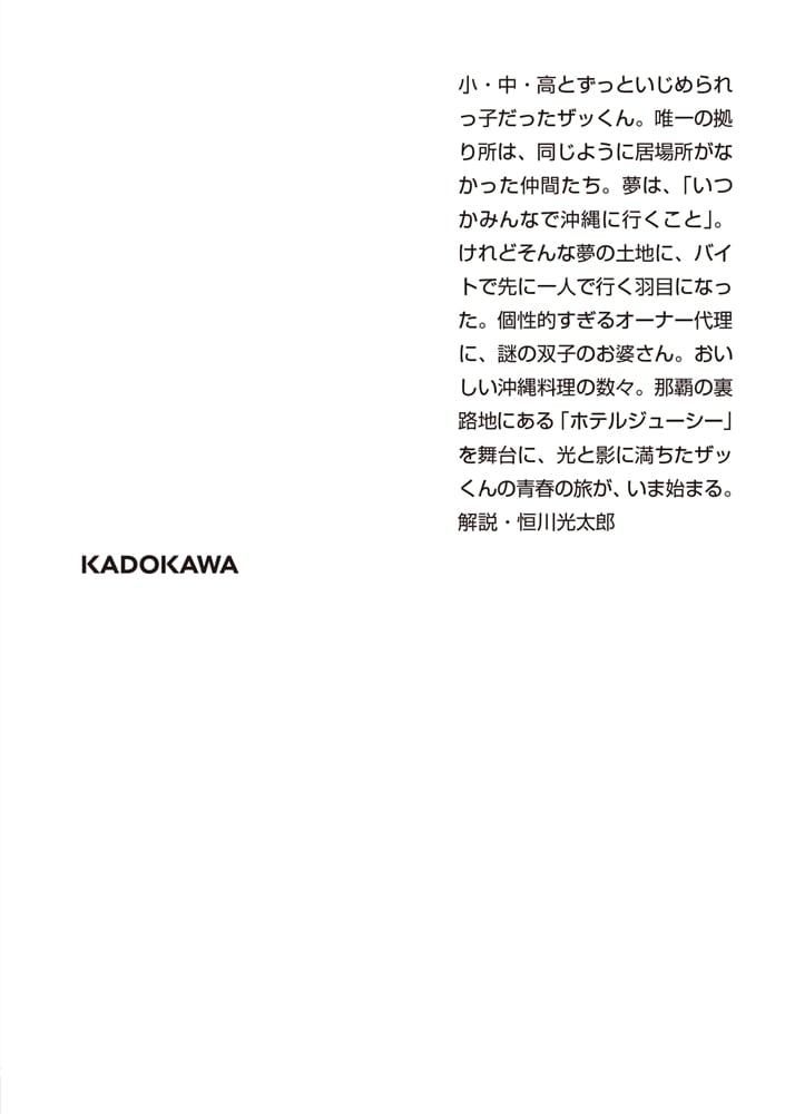 ザッくんは5カ国ミックスの大学1年生。中高時代「ザンパ」(残念なパーマ)と呼ばれ、残念なミックスだと自認している。居場所がない日々の中、親友のゴーさん、アマタツとの約束「いつか三人で沖縄へ行こう」が拠り所だ。ある日、沖縄の「ホテルジューシー」でバイトすることに。待ち受けるは美味しい沖縄料理に掴みどころのないオーナー代理、超個性的な宿泊客。ザッくんの新しい旅が始まる。解説・恒川光太郎